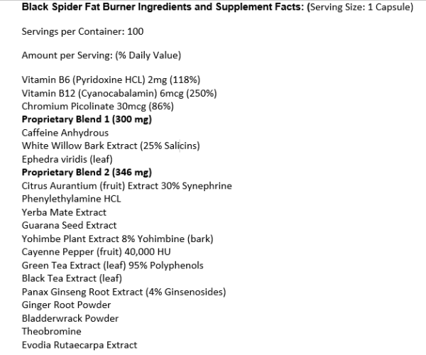 Trapped within the "web" of each capsule is an ECA blend of Ephedra, caffeine USP and White Willow, along with what we consider to be some of the world's most intensely invigorating thermogenic and lipolytic catalysts including Citrus Aurantium and Yohimbe.