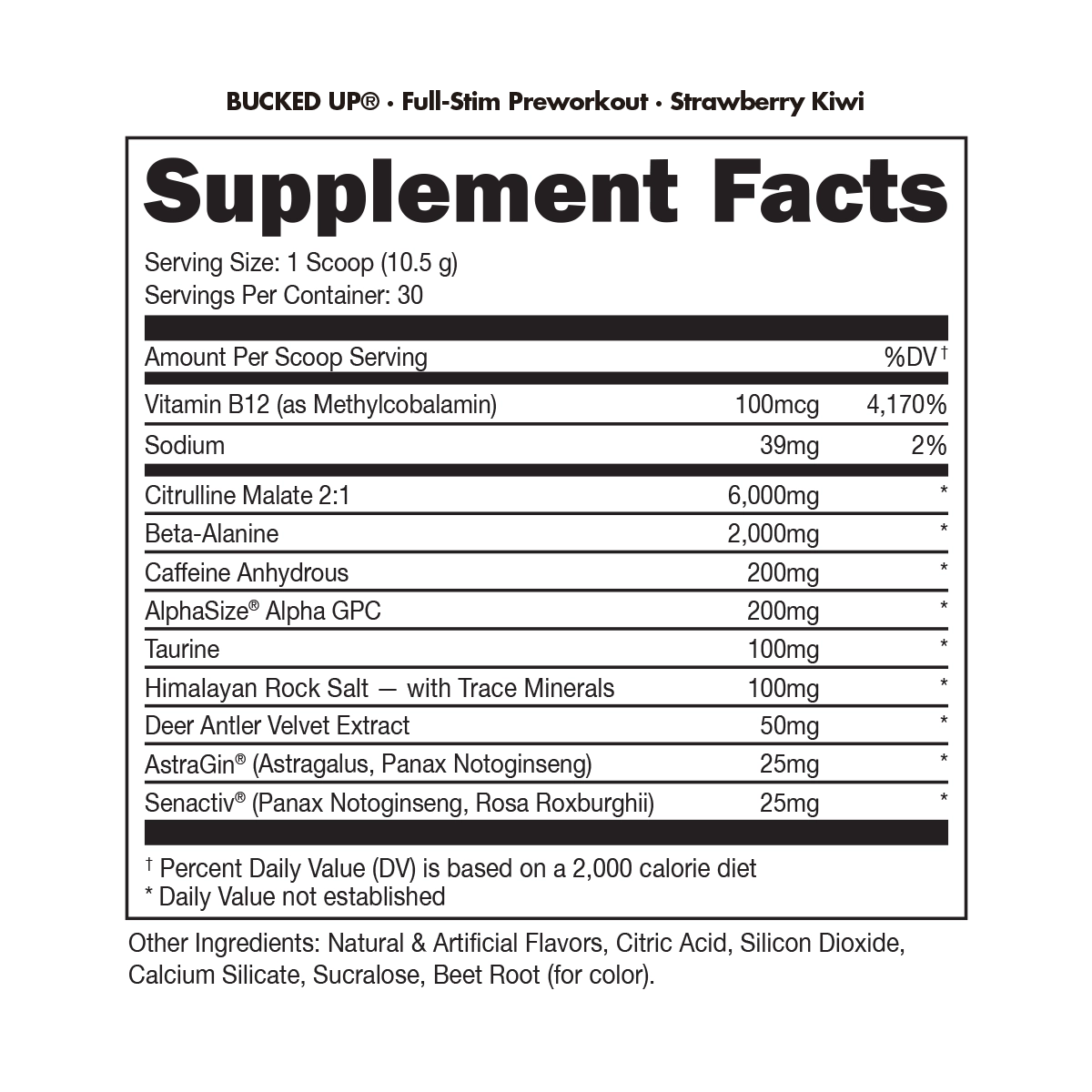 We don’t use proprietary blends. We have nothing to hide. You won’t find ineffective doses of any ingredients in Bucked Up® because we know you don’t want to pay for supplements that don’t work. Designed for serious athletes, bodybuilders, and anyone else looking for pump, focus, energy, and growth, Bucked Up® is the pre-workout everyone can agree on.* Contains 200mg caffeine per serving.
