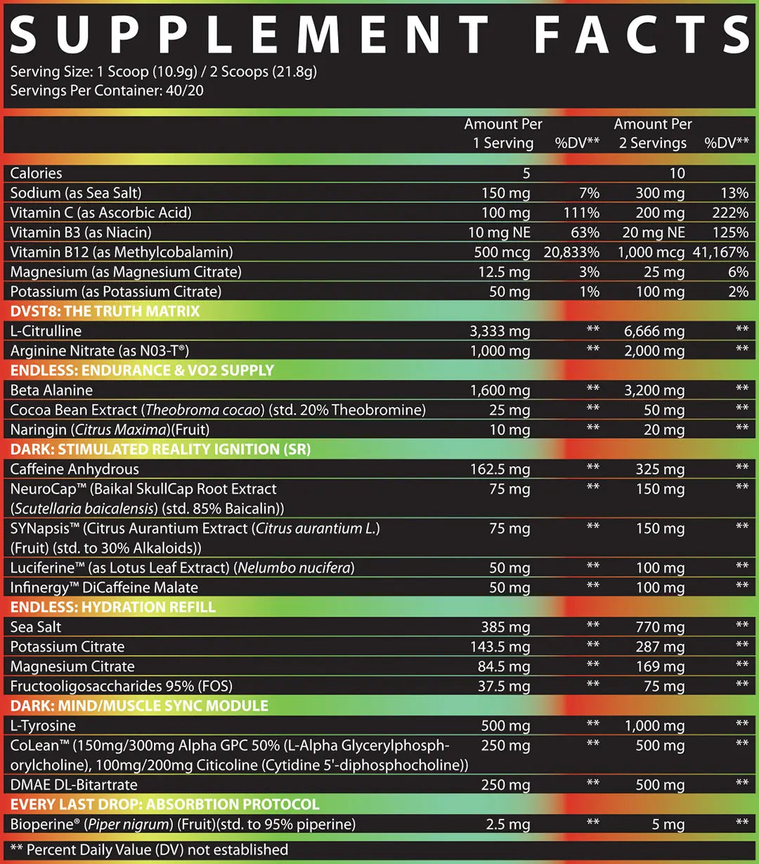 At its core lies the groundbreaking 3D PUMP Breakthrough blend, a synergistic mix geared towards promoting vasodilation, amplified strength, and unprecedented power. Coupled with the inclusion of PeakO2 adaptogenic mushrooms that cater to your body's unique needs, NO3-T nitrates for that extra burst of energy, and CoLEAN, a potent amalgamation of top-tier choline sources, DVST8 stands unrivaled in its category. Best of all, each and every ingredient in DVST8 Global is globally compliant.