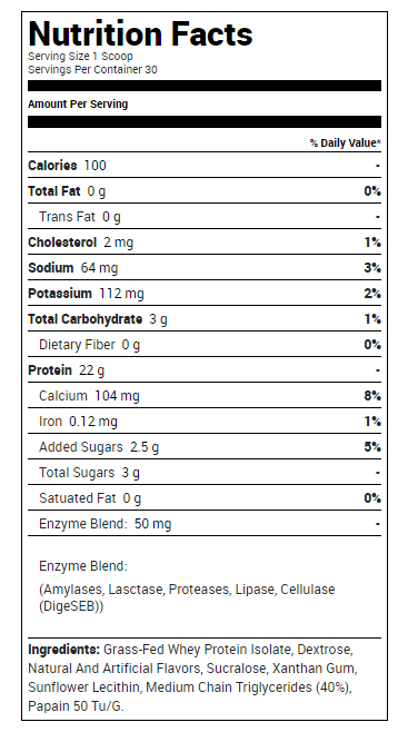 Farm Fed, Grass Fed Whey Protein Isolate. For The Hardest Workers In The Gym. Farm Fresh. Grass Fed Whey Protein Isolate. 22g Protein. Digeseb, Digestive Enzyme Blend. Cold Pressed. Farm Fed Facts: 1) Grass Fed Whey Protein Isolate. 2) 22g Of Protein. 3) Hormone & Antibiotic Free. 4) Cold-Processed Ultra & Micro Filtered. 5) Digeseb Digestive Enzyme Blend. 6) Naturally Occurring EAAS & BCAAS. 7) Low Fat. 8) No Amino Spiking.