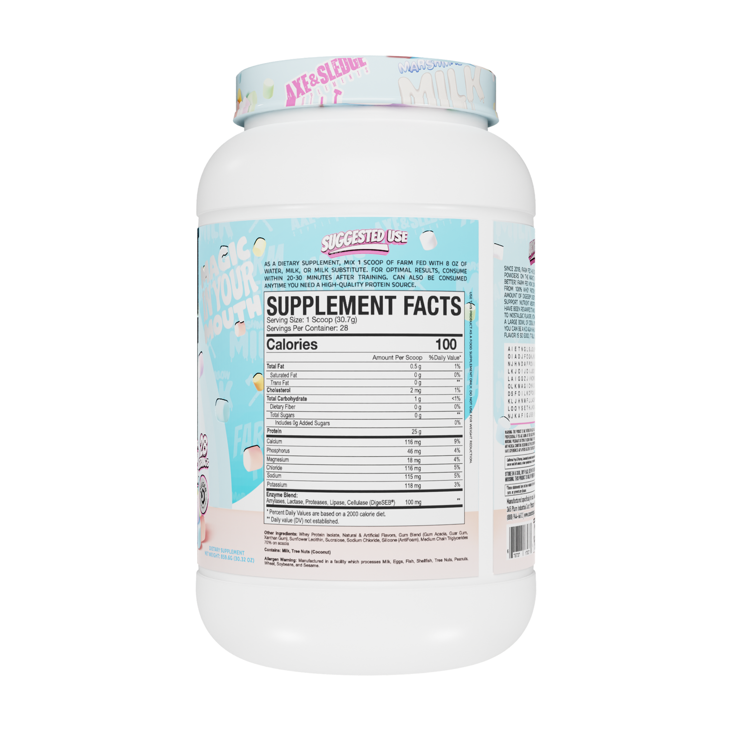 Farm Fed, Grass Fed Whey Protein Isolate. For The Hardest Workers In The Gym. Farm Fresh. Grass Fed Whey Protein Isolate. 22g Protein. Digeseb, Digestive Enzyme Blend. Cold Pressed. Farm Fed Facts: 1) Grass Fed Whey Protein Isolate. 2) 22g Of Protein. 3) Hormone & Antibiotic Free. 4) Cold-Processed Ultra & Micro Filtered. 5) Digeseb Digestive Enzyme Blend. 6) Naturally Occurring EAAS & BCAAS. 7) Low Fat. 8) No Amino Spiking.