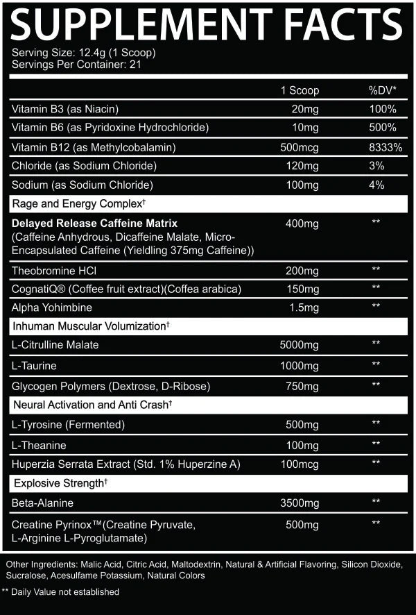 INHUMAN is like a jolt of lightning to the system, a surge of energy and focus that propels you forward with unstoppable momentum. It's a portal to a realm of heightened intensity and explosive power, where the barriers between mind and body dissolve and you become a force of nature. But beware, for this power comes at a price, and the darkness that lurks within us all may be unleashed if we are not careful.