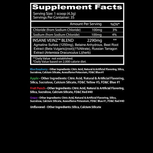 UNPARALLELED VASCULARITY. Loaded with Agmatine Sulfate and Betaine Anhydrous to increase nitric oxide production, Insane Veinz is here to give blood bursting vascularity whether you are cutting for the stage or needing that extra boost in the gym.