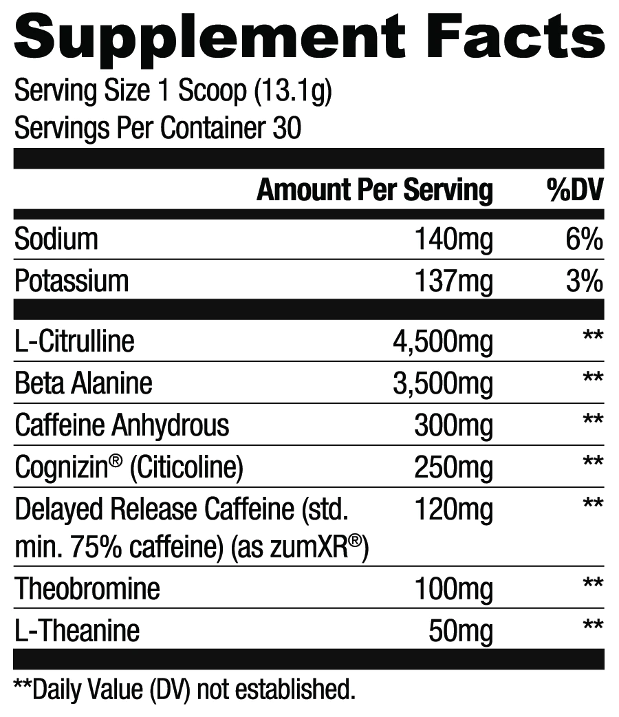 PUMP. ENERGY. STRENGTH. 390mg Caffeine, 4.5g L-Citrulline, 3.5g Beta Alanine Per Scoop. Advanced Benefits of RYSE Loaded Pre. Fuel Your Greatness. VitaCholine. ThinkAmine. ZumXR.