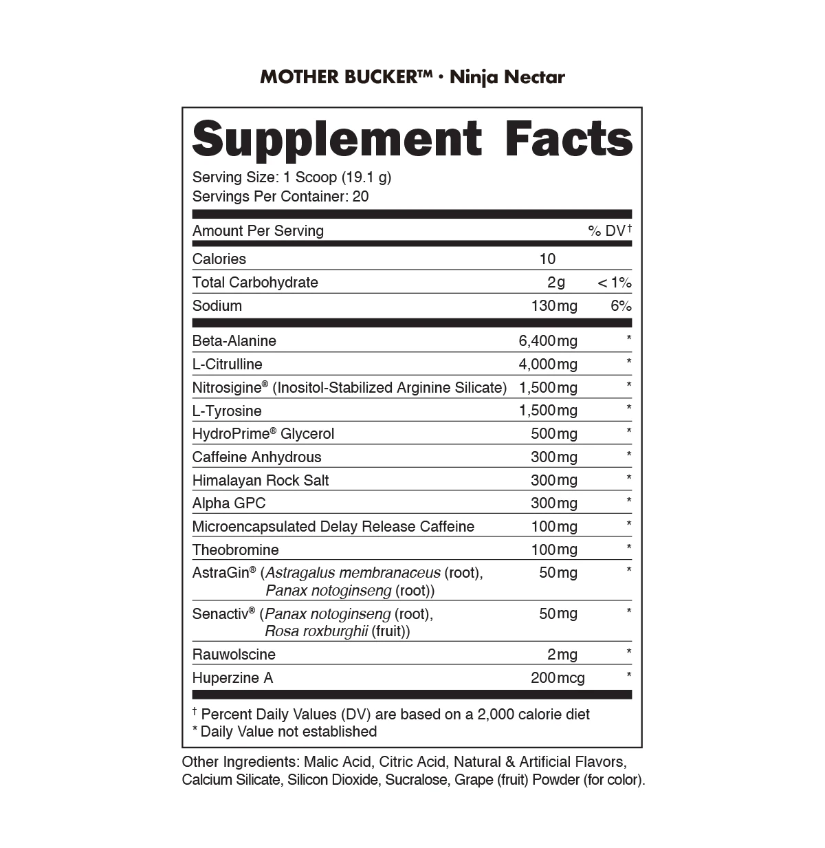 The Mother Of All Pre-Workouts. Mother Bucker. Pump, Focus, Strength, Energy. Natural & Artificially Flavors. Dietary Supplement. Warning: High-Stimulant. 6,400mg Beta-Alanine. 1,500mg Nitrosignine. 4,000mg L-Citrulline. Hydroprime Insane Pumps. 400mg Caffeine. Alpha GPC + Huperzine A + L-Tyrosine. Mood, Mind And Focus. Nootropic Pre-Workout. Introducing...The Primordial Mother Of All Pre-Workouts; The Alpha And Omega; The Hands Down Most Intense Pre-Workout Formula We, Or For That Matter Anyone, Has Ever Created — Our Magnum Opus, If You Will. Mother Bucker Pre-Workout Was Designed Specifically For Elite Stim-Junkies, Advanced Athletes, And Seasoned Fitness Enthusiasts. Take Mother Bucker To Relive That First-Time Pre-Workout Feeling — Prepare To Conquer.