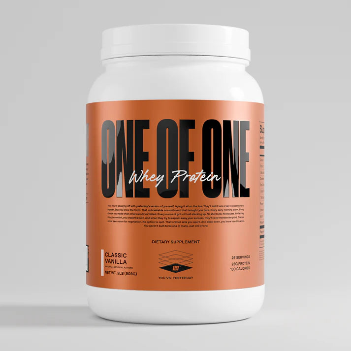 ONE OF ONE Whey Protein is packed with 25 grams of custom-formulated, high-quality protein to fuel lean muscle growth and speed up recovery. With added prebiotic fiber and digestive enzymes, it's formulated for smooth digestion and maximum absorption, so every gram goes to work. This isn't just protein—it’s your foundation for hitting new levels.