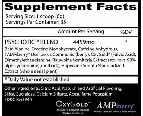 Warning: DO NOT TAKE PSYCHOTIC® IN EXCESS OF ITS RECOMMENDED DOSAGE. PSYCHOTIC® is not intended for use by persons under the age of 18. Do not consume caffeine from other sources, including but not limited to, coffee, tea, soda, and other dietary supplements or medications containing phenylephrine or caffeine. Do not use PSYCHOTIC® for more than 8 weeks. Consult with your physician prior to use if you are pregnant or nursing, or if you are taking medication, including but not limited to, MAOI inhibitors, antidepressants, aspirin, nonsteroidal anti-inflammatory drugs or products containing phenylephrine, ephedrine, pseudoephedrine, or other stimulants. Consult you physician prior to use if you have a psychiatric or epileptic disorders, difficulty urinating, diabetes, high blood pressure, cardiac arrhythmia, recurrent headaches, enlarged prostate or glaucoma. Discontinue 2 weeks prior to surgery or if you experience rapid heartbeat, dizziness, severe headaches or shortness of breath. THIS PRODUCT CONTAINS CAFFEINE.